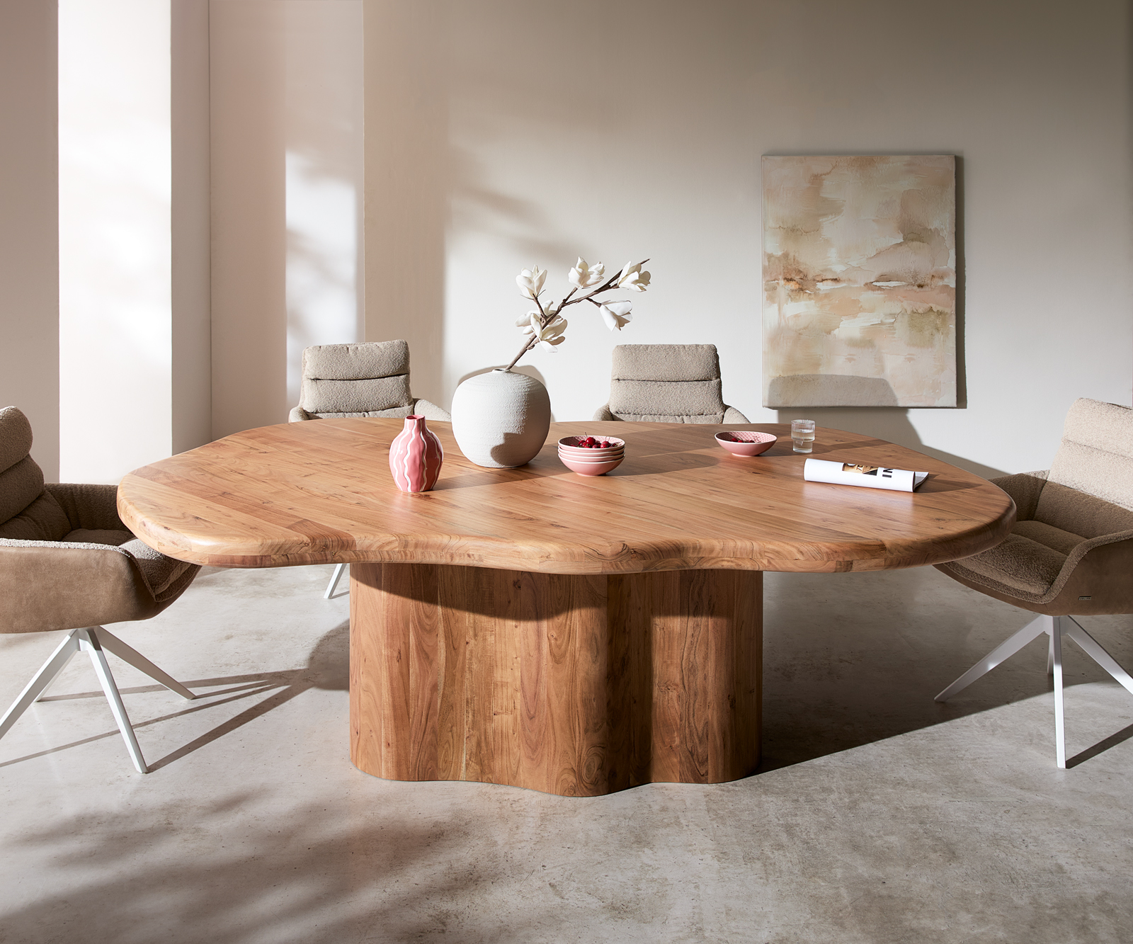 Či už dlhé večery s priateľmi alebo každodenný rodinný život – Herkon ponúka priestor na stretnutia. Zdvojená stolová doska dodáva stolu pôsobivú stabilitu, zatiaľ čo organicky tvarované nohy z masívneho akáciového dreva zabezpečujú pevný stojan. Lakovaný povrch spoľahlivo chráni drevo a uľahčuje starostlivosť v každodennom používaní. Ideálny pre otvorené obytné koncepty, veľké jedálne a ľudí, ktorí si cenia úprimný materiál a výrazný dizajn.