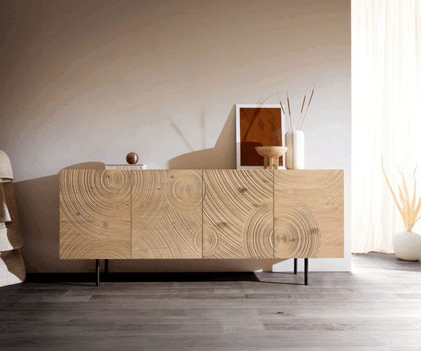 Komoda Ashara z ušľachtilej dubovej dyhy spája remeselnú precíznosť s moderným dizajnom. Obzvlášť pôsobivé sú zaoblené 3D frézovania, ktoré každému priestoru dodávajú jedinečnosť. Štyri dvierka ponúkajú pohodlný úložný priestor, ľahko ovládateľný vďaka kvalitným kovaniam.