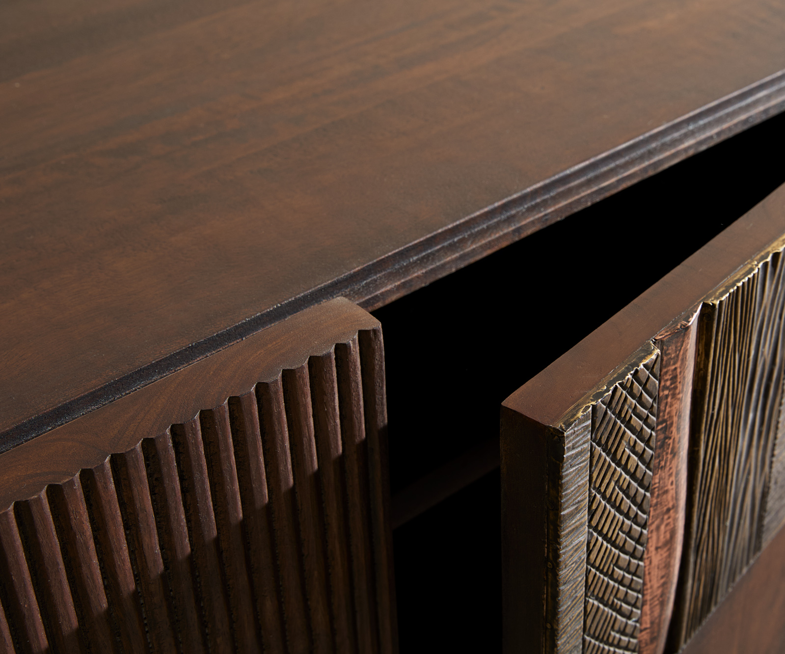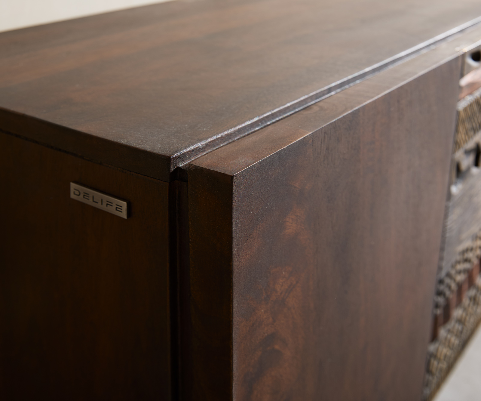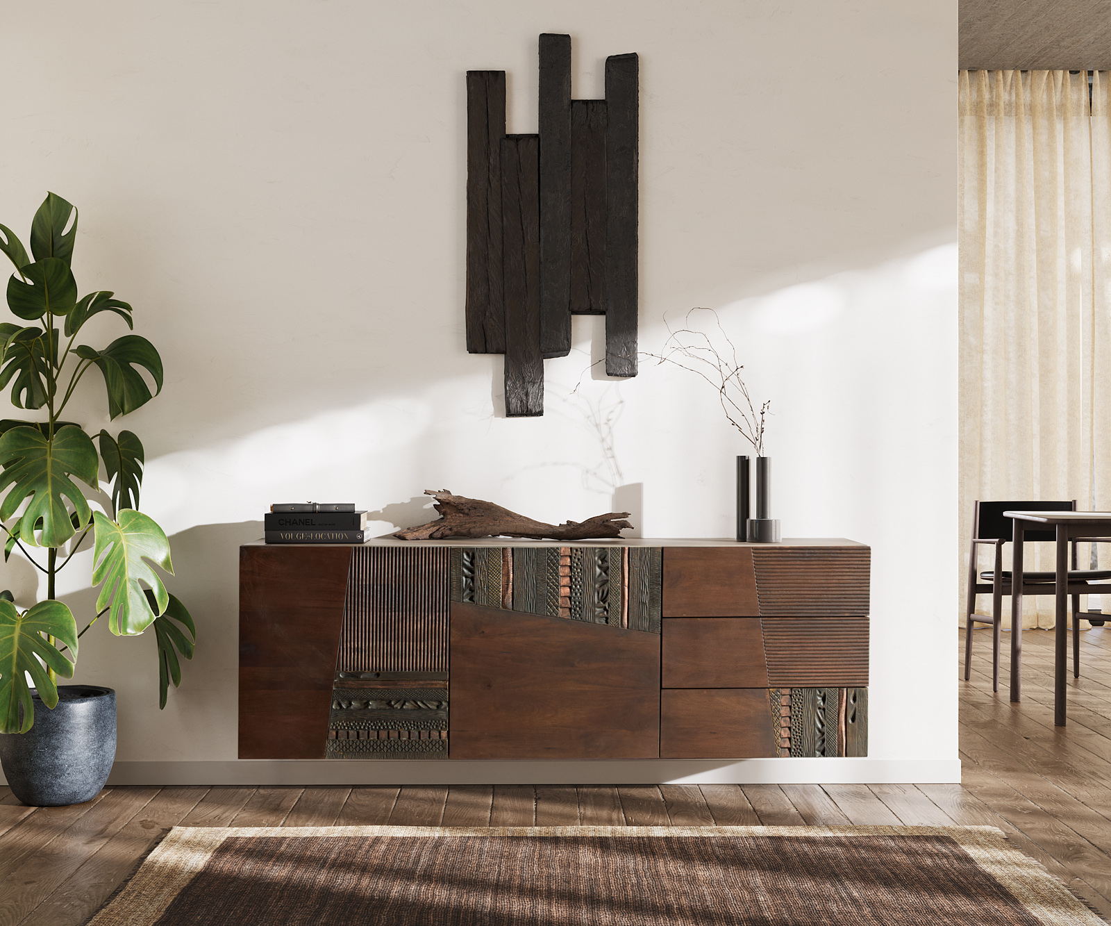 Komoda Imara spája umelecký dizajn so závesnou eleganciou. Vylepšená dyhou z mangového dreva v teplej hnedej farbe prináša útulnosť, zatiaľ čo čelá s rôznorodými štruktúrovanými vzormi vytvárajú fascinujúce akcenty. Vďaka nástennému uchyteniu získava nábytok modernú ľahkosť a dodáva tvojmu priestoru priestrannosť.