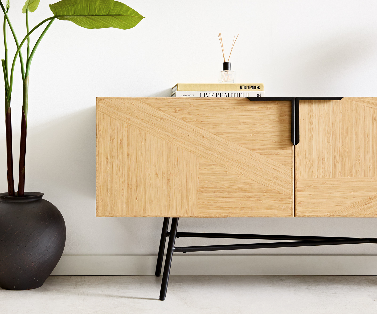 Obohať svoj domov našou výnimočnou komodou, ktorá dokonale kombinuje prírodné materiály a moderný dizajn. So šírkou 175 cm ponúka dostatok úložného priestoru a zaujme svojím exkluzívnym dizajnom. Čelá sú dyhované pravým bambusom prírodnej farby a sú starostlivo ručne spracované do umeleckého vzoru, ktorý sa plynulo tiahne cez celú prednú časť a vytvára harmonický celok. Čierny korpus z mangového dreva je špeciálne upravený, aby výrazne zvýraznil hlbokú kresbu dreva.