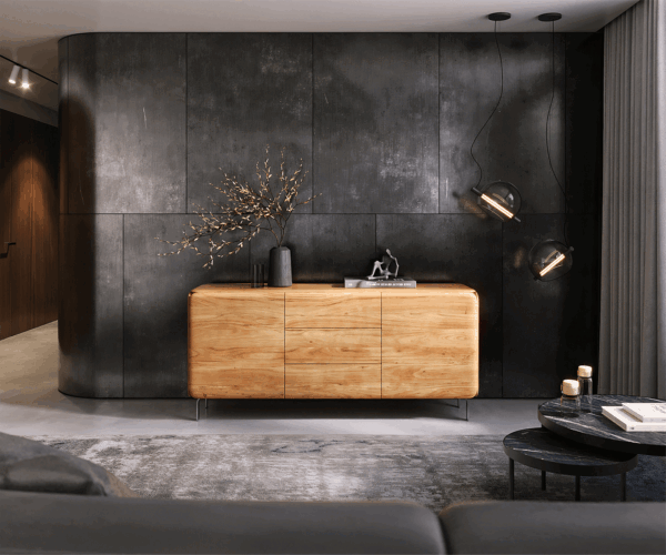 Kolekcia Shavani Akácia presvedčí čistými tvarmi a kvalitnými materiálmi. 15 cm vysoké, jemné strieborné nohy z nerezovej ocele dodávajú komode moderný, industriálny nádych a zabezpečujú optimálnu stabilitu. Zároveň poskytujú dostatočný priestor od zeme, takže priestor pod ňou sa ľahko udržiava v čistote – ideálne pre uprataný domov so štýlom.