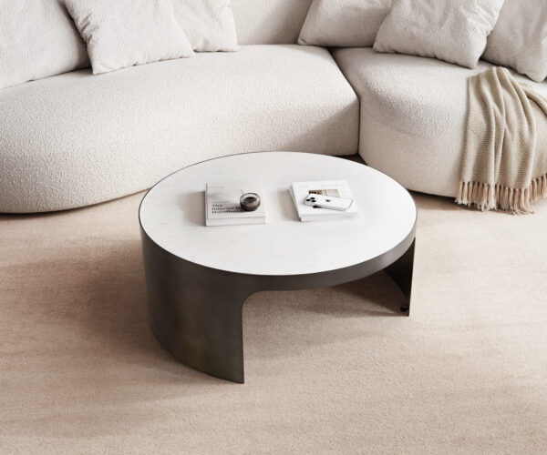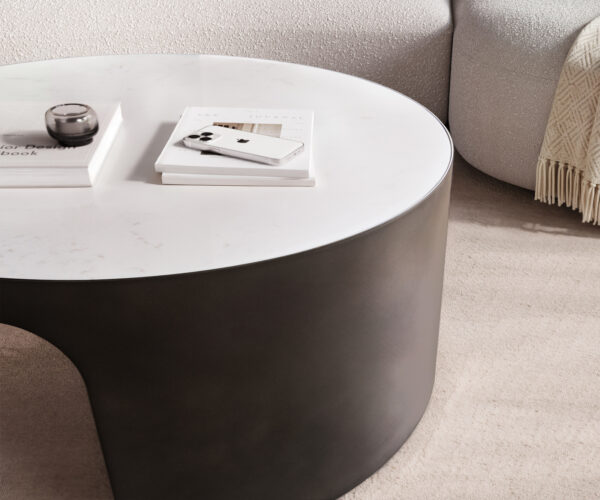 Konferenčný stolík Alerio v bielo-čiernej farbe stelesňuje modernú eleganciu v dokonalej podobe. Jeho svetlá mramorová doska prináša do tvojho obývacieho priestoru ľahkosť a lesk, zatiaľ čo kovová podstava v prevedení Black Antique vnáša do dizajnu jemnú dynamiku. Výsledkom je luxusný konferenčný stolík, ktorý dokonale spája estetiku a funkčnosť.