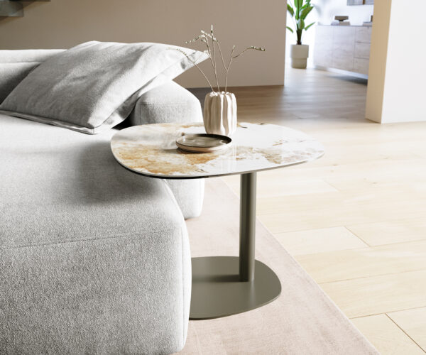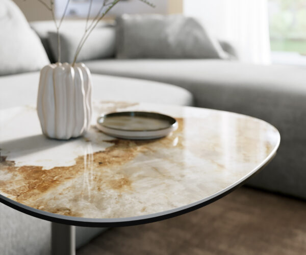 V módnom oválnom tvare zažiari konferenčný stolík Edge v nádhernej melange bielo-béžových odtieňov, ktoré pripomínajú najjemnejší mramor. Doska konferenčného stolíka bola starostlivo leštená a pôsobí mimoriadne hladko a takmer mäkko na dotyk. Je vyrobená z kvalitnej keramiky a každý deň ťa presvedčí svojou jednoduchou údržbou a dlhotrvajúcou krásou. Výnimočný oválny tvar dokonale dopĺňa dizajn výrazným spôsobom a dodáva mu moderný a exkluzívny charakter.