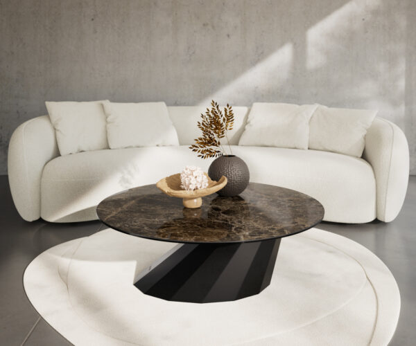 S konferenčným stolíkom Edge Emperador Extra si do svojho domova prinášate jedinečný dizajn. Komplexná a pôsobivá hĺbka elegantnej dosky konferenčného stolíka zobrazuje krásu a nadčasovosť mramoru v osobitnej autentickosti. Ako pod lupou sú zvýraznené nádherné farebné prechody teplých hnedých tónov a najjemnejšie žilkovanie, ktoré vytvára vlastnú, takmer hypnotickú komplexnosť. Majstrovsky vyrobená z jedného kusu slávnej talianskej keramike Laminam®, vzácna mramorová optika môže bezchybne rozvinúť svoj efekt vo všetkých svojich podobách, úplne bez prerušení alebo rušivých škár. Nádherná vysokolesklá povrchová úprava a elegantný okrúhly tvar dokončujú náročný dizajn, ktorý vašej obývačke dodá nezabudnuteľnú atmosféru.