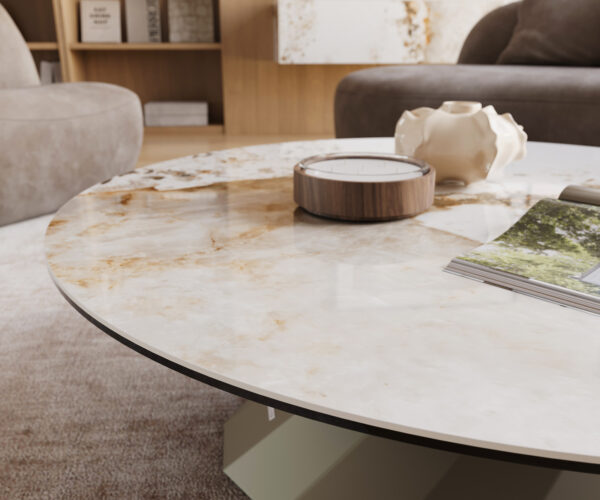 Prekrásny konferenčný stolík Edge skrášli tvoju obývačku. Je vyrobený z kvalitnej keramiky, ktorá svojou jedinečnou farebnou hrou v bielo-béžových odtieňoch pripomína vzácny mramor a svojou starostlivo leštenou povrchovou úpravou rozžiari tvoju obývačku. Keramika je známa svojou odolnosťou a pevnosťou. Každý deň ťa nadchne svojou jednoduchou údržbou. Vďaka okrúhlemu tvaru sa tvoj konferenčný stolík Edge hodí nielen do menších priestorov, ale zároveň dokonale zvýrazní úžasné farebné prevedenie.