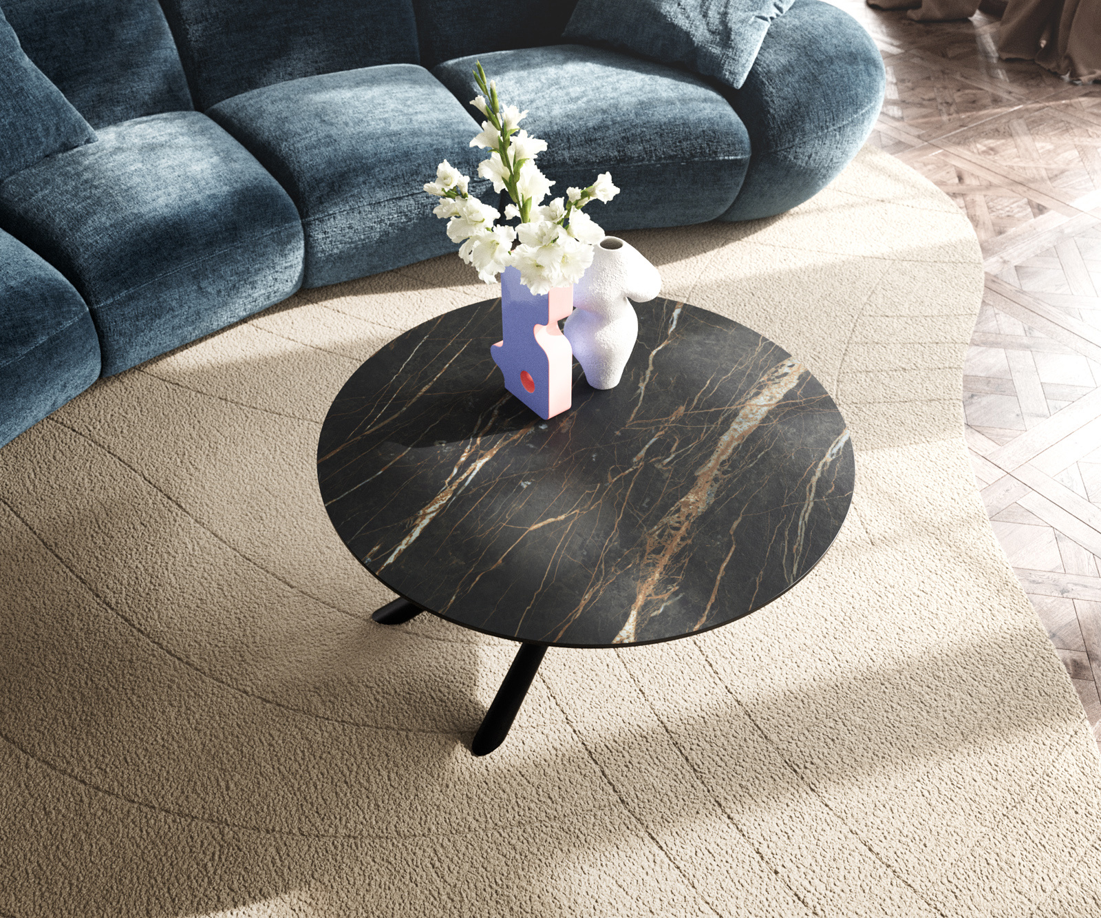 Konferenčný stolík Edge zaujme svojou okrúhlou stolovou doskou z elegantnej keramiky Laminam® v silnej hnedej farbe Noir Desir. Doska je spracovaná mimoriadne kvalitne, je veľmi odolná proti poškriabaniu a robustná. Jej povrch očarí nádhernou štruktúrovanou, takmer bridlicovou textúrou. Jemný, zatočený vzor vytvára silný obraz sily a nezlomnosti prírody a krásy, ktorá v nej prebýva.