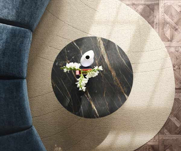 Táto konferenčný stolík je zážitok – okrúhly Edge z pravého keramiky Laminam® v hnedej farbe Noir Desir
