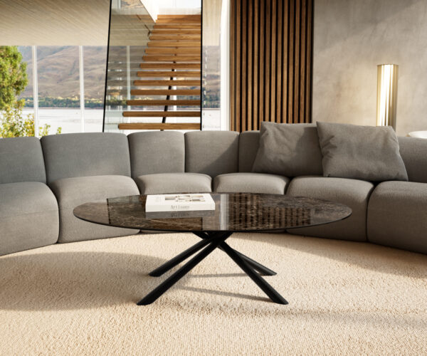 Konferenčný stolík Edge oválny 140x80 cm keramika Laminam® Emperador Extra Lucidato tmavohnedá Sarity kov čierna