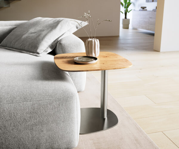 Konferenčný stolík Edge zaoblený tvar 50x50 cm dub prírodný švajčiarska hrana Eleny nerezová oceľ kefovaná