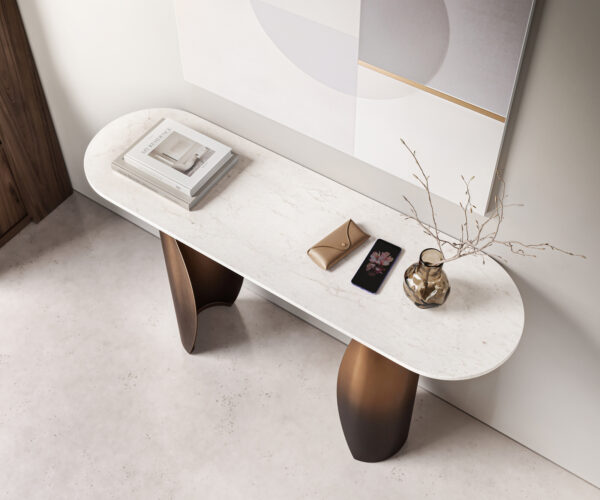 Jemná silueta robí zo Soleny harmonický dizajnový prvok v predsieni, obývacej izbe alebo za pohovkou. Štíhly tvar pôsobí vzdušne, zatiaľ čo kvalitný materiálový mix zaručuje stabilitu a hodnotu. Solena je konzolový stolík do priestorov, ktoré si vedome vyberajú eleganciu a čistotu. Doska a podstava sa musia zmontovať, aby sa dizajn mohol plne prejaviť.