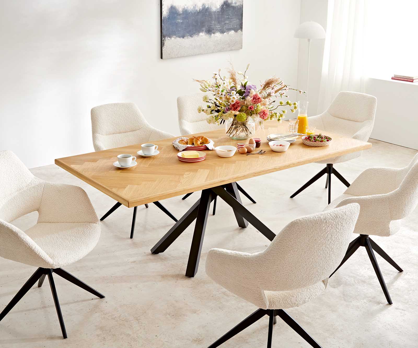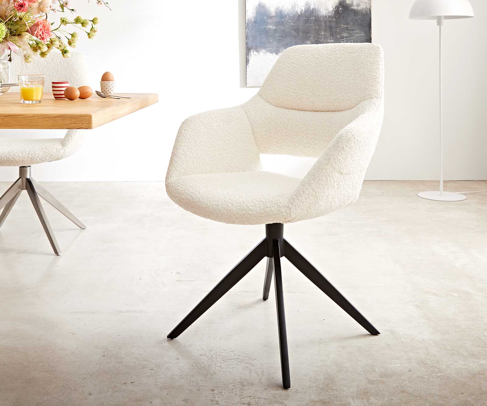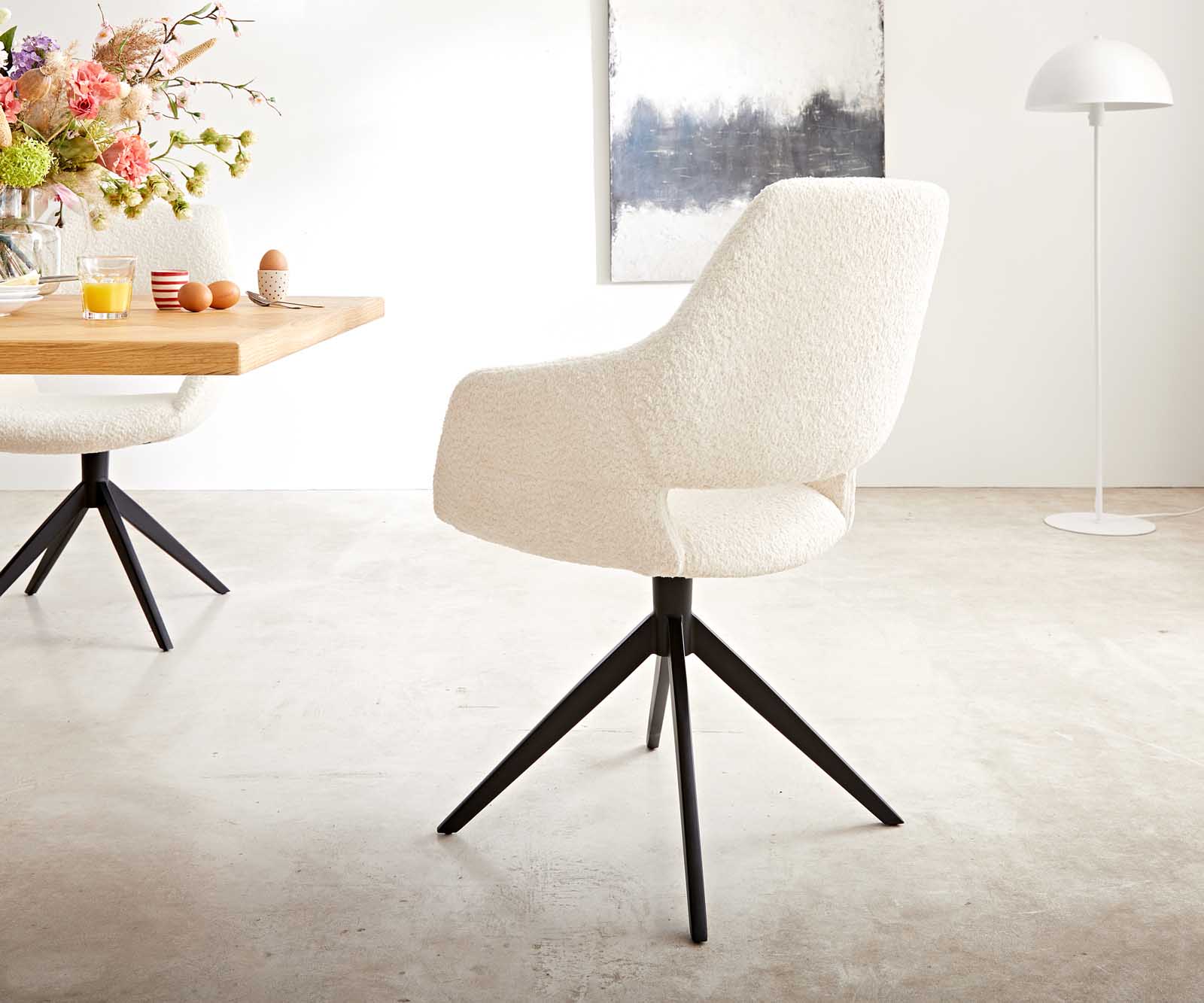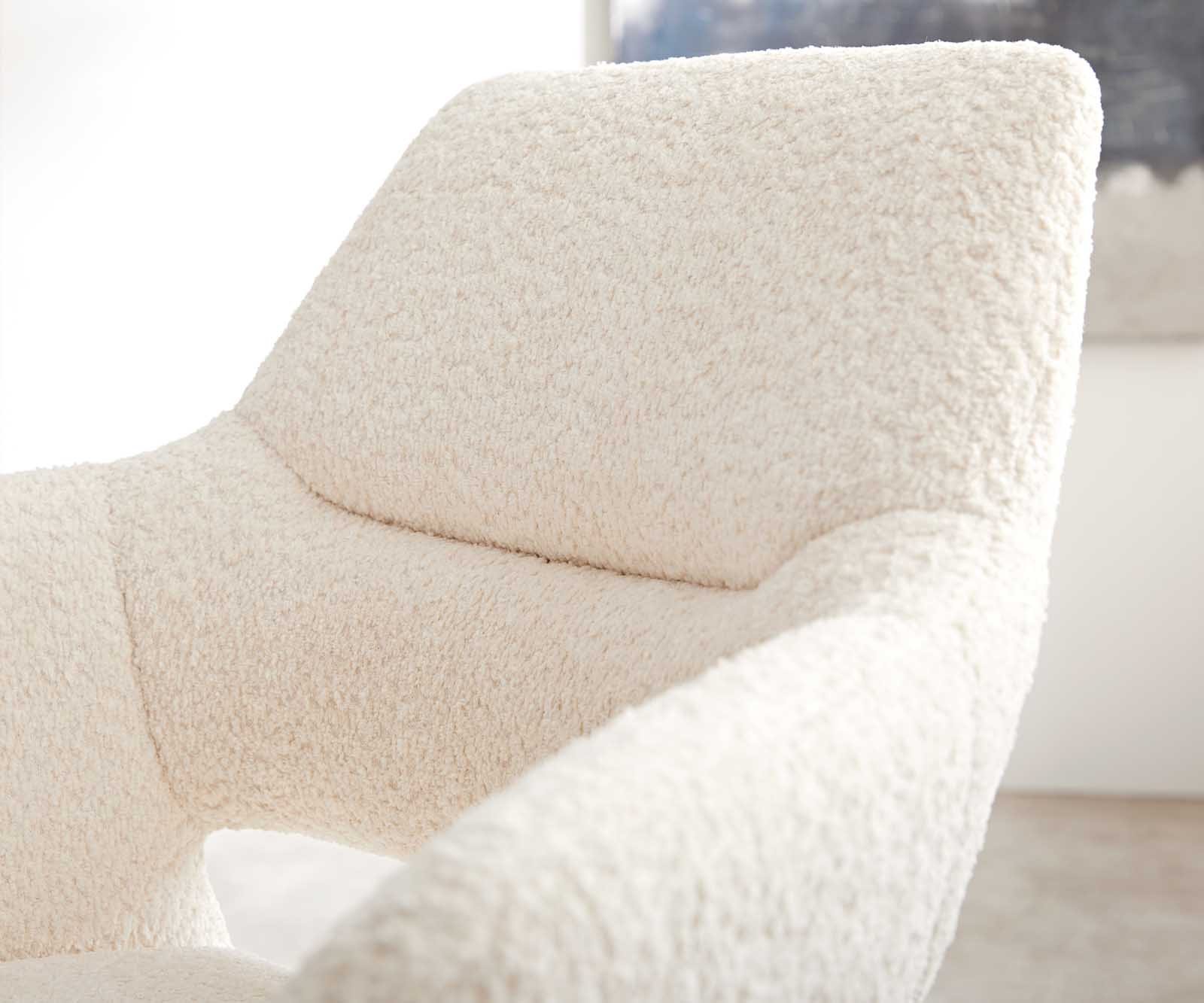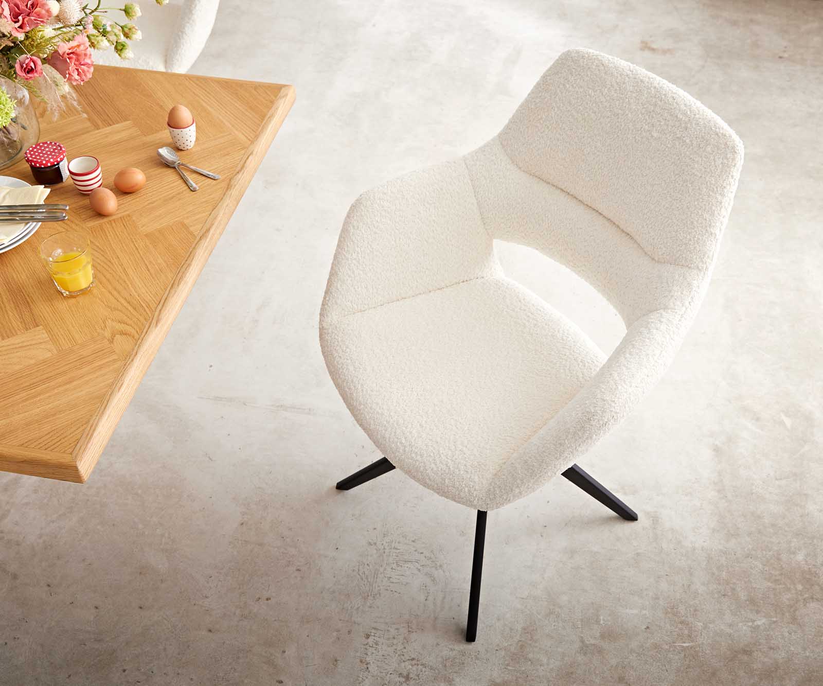 Elegantná látka bouclé je obzvlášť mäkká a príjemná na dotyk, zároveň však odolná a nenáročná na údržbu. Žiari v teplom bielom odtieni a v každej jedálni vytvára nadčasovo krásne akcenty.