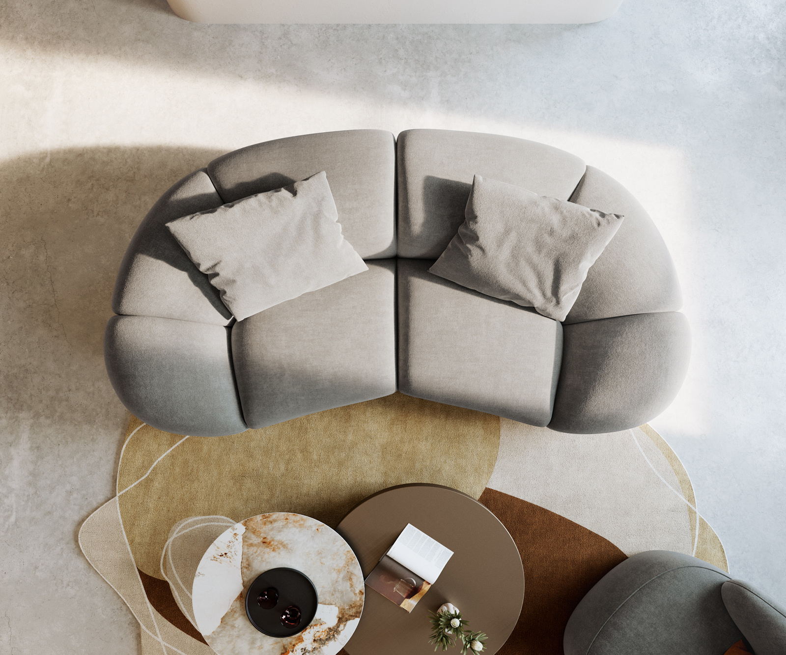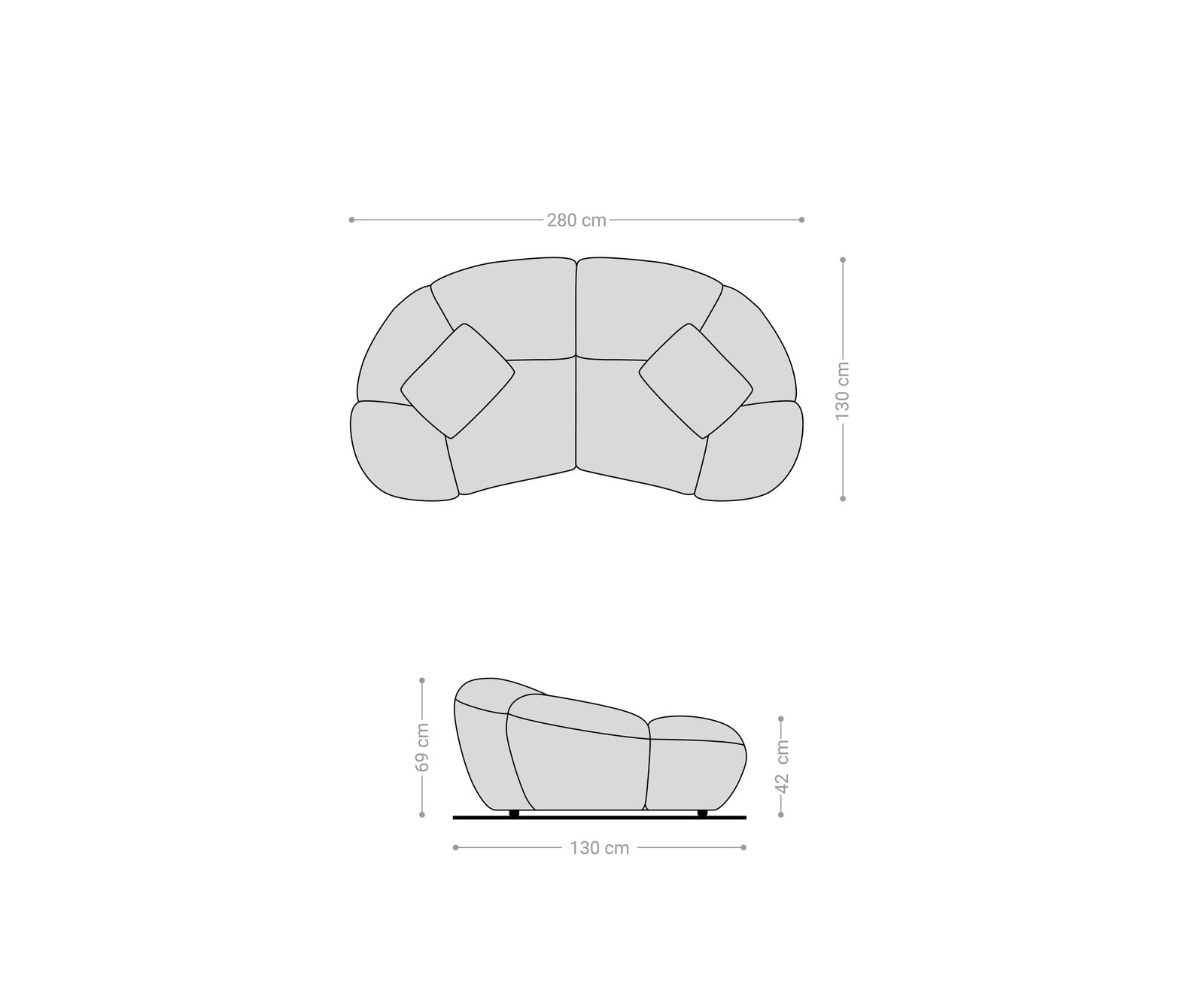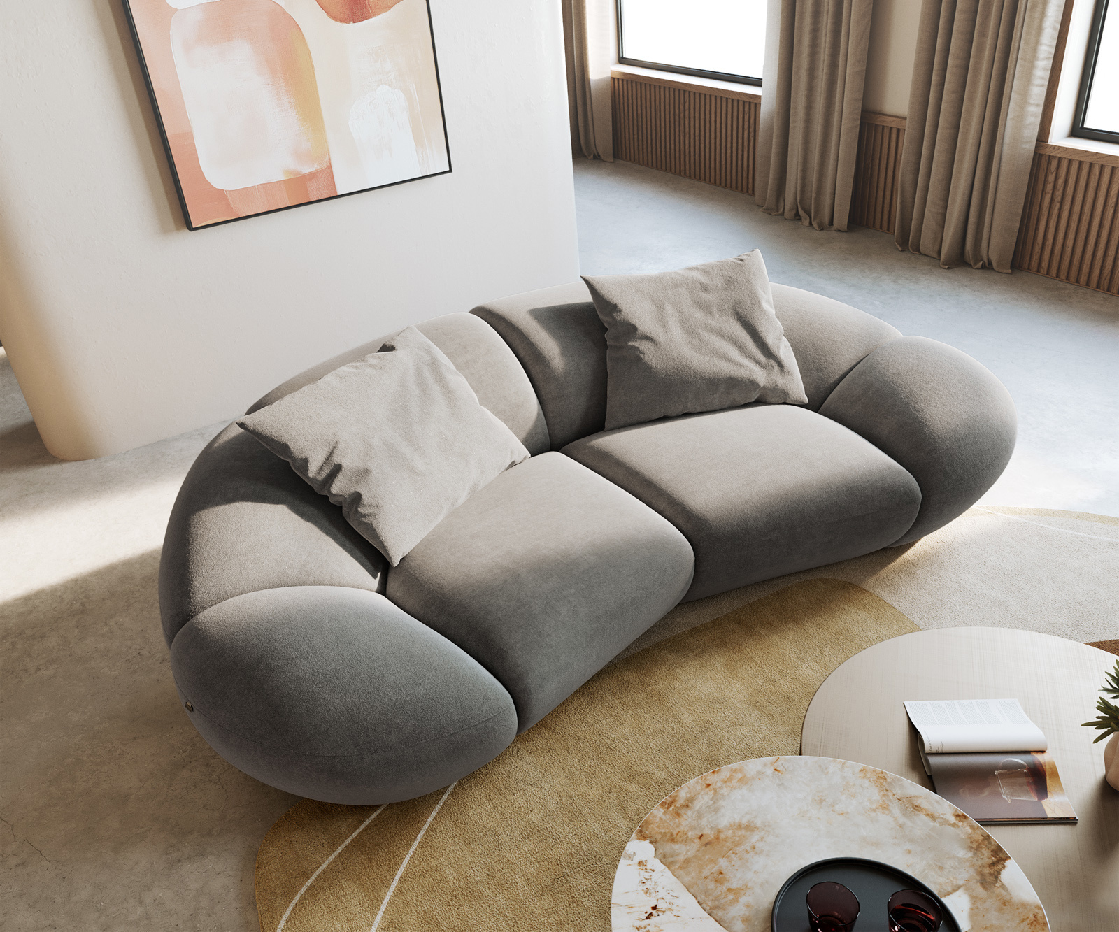 Charakteristický polmesiacový tvar dodáva pohovke výnimočnú charizmu a prináša moderné akcenty do vášho interiéru. Priestranné čalúnenie zabezpečuje príjemný pocit zo sedenia, zatiaľ čo kvalitné spracovanie a stabilná konštrukcia zaručujú dlhodobú kvalitu. Dva priložené vankúše sú vybavené praktickými zipsami, takže poťahy je možné jednoducho odňať podľa potreby.