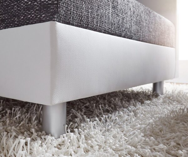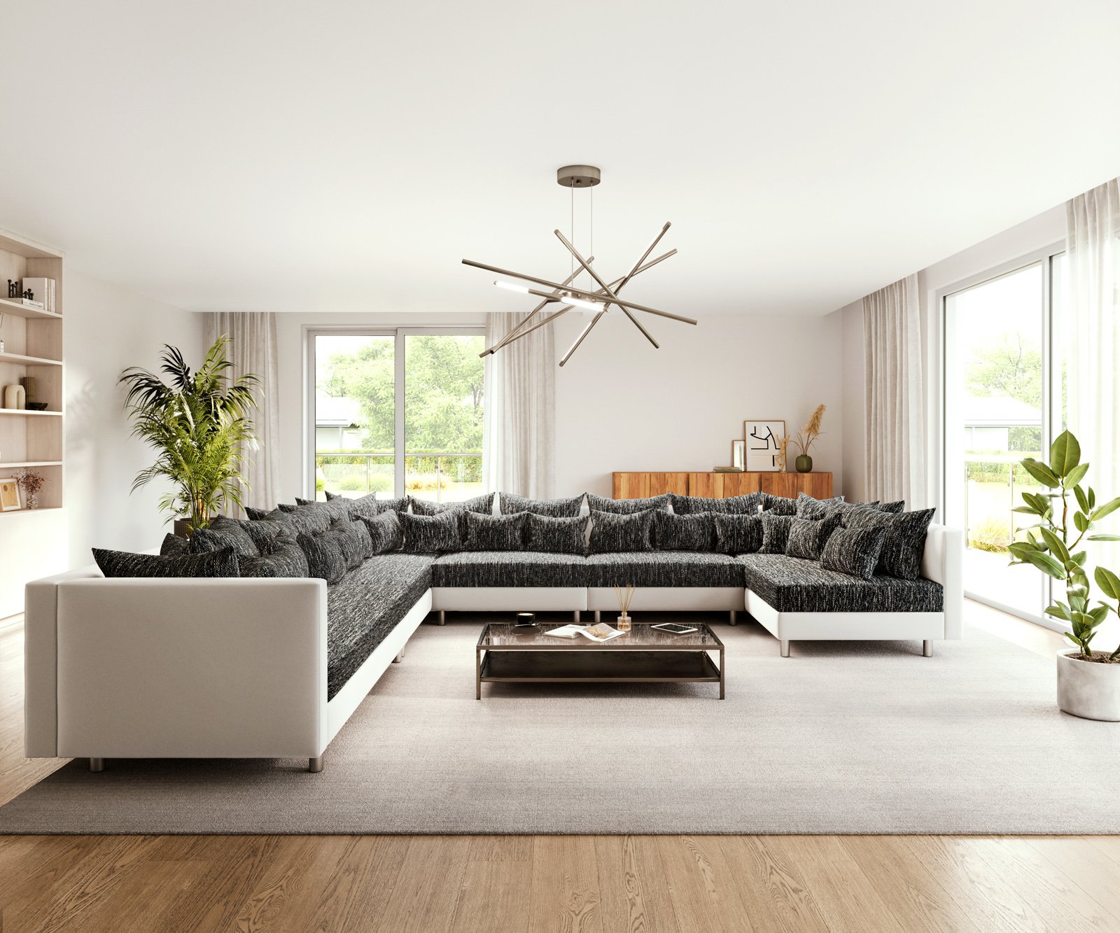 XXL pohovka v tvare „U“ Clovis zaujme moderným tvarovaním a kontrastným vzhľadom. Každý prvok pohovky má korpus potiahnutý robustnou bielou umelou kožou. Sedáky sú pri tomto dizajnovom pohovke čalúnené odolnou štruktúrovanou látkou v čiernej farbe. Čalúnený nábytok sľubuje vynikajúci komfort s množstvom veľkých i malých vankúšov. Pohovka stojaca na okrúhlych plastových nohách sa vyznačuje pôsobivým dizajnom, odolnými poťahovými materiálmi a jednoduchou údržbou, pričom ponúka aj ďalšiu dôležitú výhodu pre vás.
