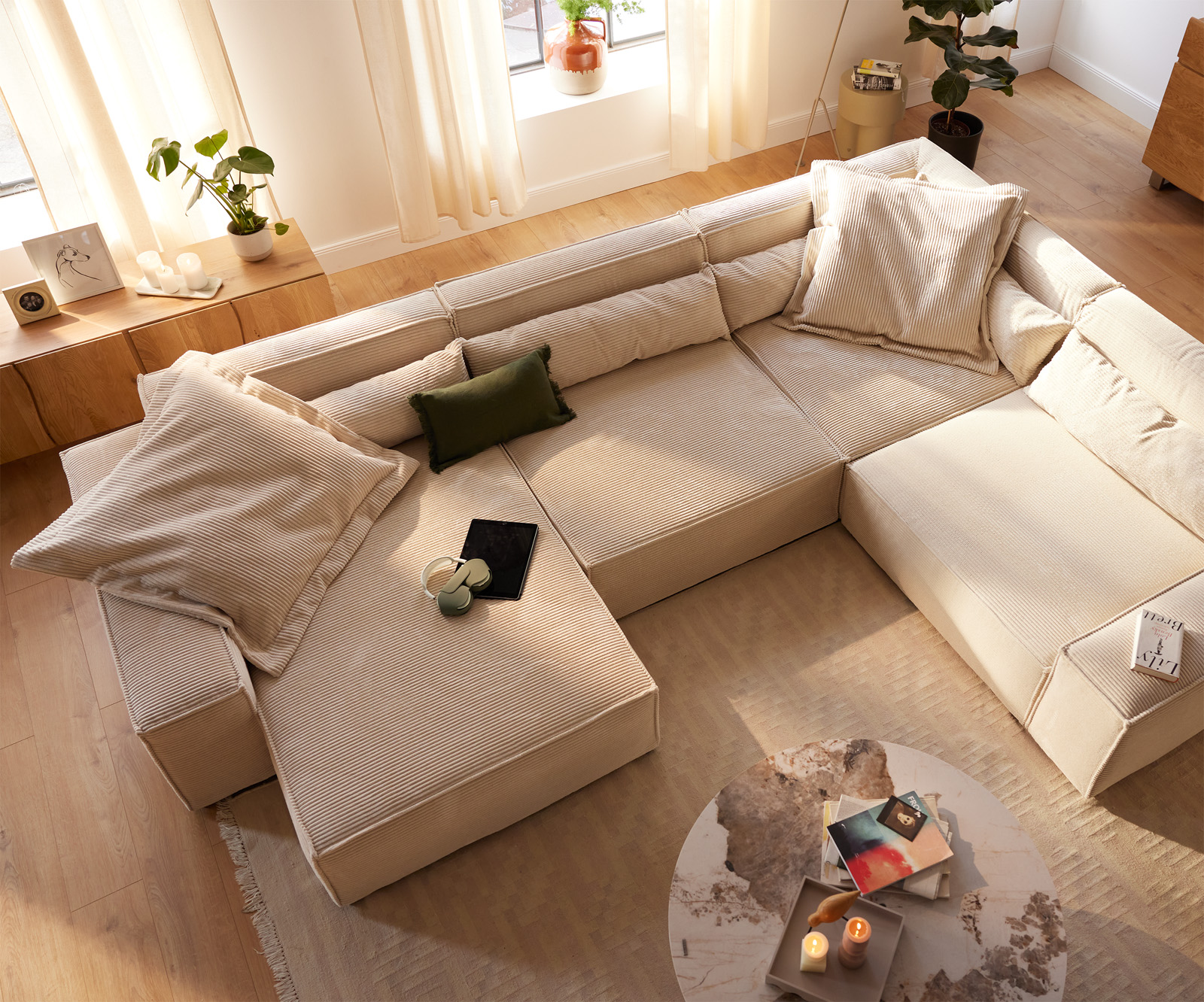 Pohovka v tvare U Sirpio XL 360×260 cm plyšový manšester béžová variabilné ležadlo