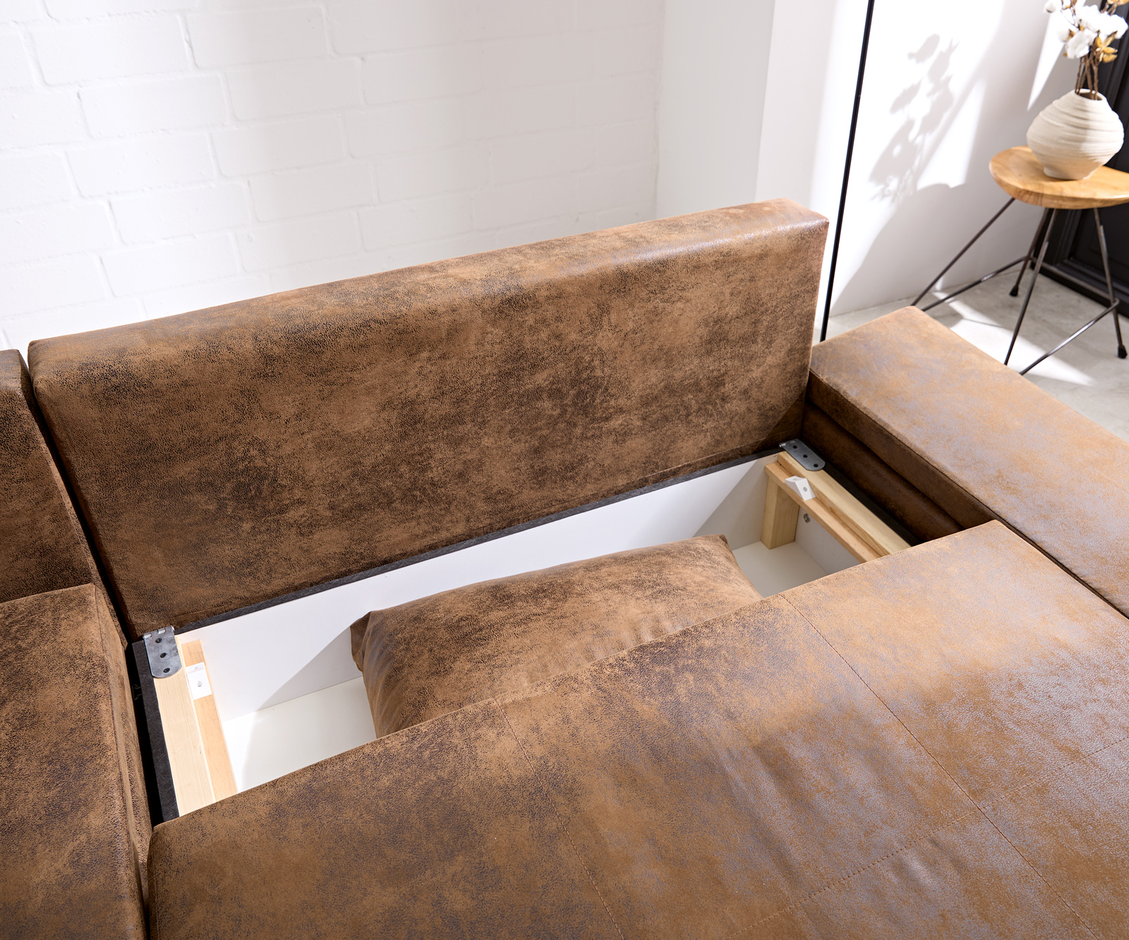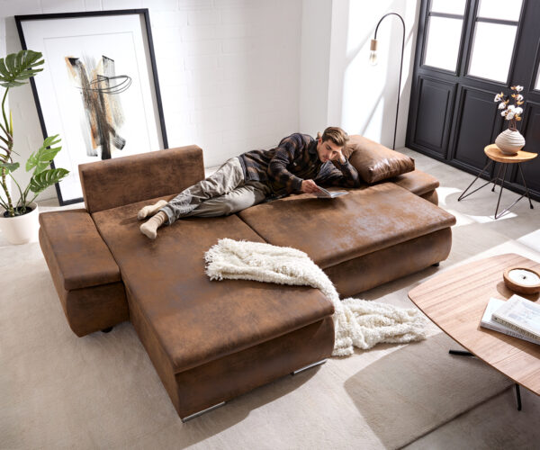 Bohaté vybavenie obytného priestoru Abilene umožňuje pohodlné sedenie v spoločnosti aj vynikajúci komfort na ležanie pre nerušený nočný odpočinok. Pohovka sa rýchlo premení na funkčné lôžko pre hostí a nečakaných návštevníkov. Integrovaný úložný priestor poskytuje veľa miesta na posteľnú bielizeň, prikrývky a vankúše. Maximálny komfort sedenia zabezpečuje táto moderná sedačka vďaka opierkam, trom opierkam na chrbát a pravostrannej otomane, ktoré poskytujú pohodlie v každej polohe. Príjemný poťah z odolného hnedého mikrovelúru v elegantnom vintage vzhľade navyše podporuje príjemný pocit komfortu. Nosag pružina dopĺňa funkčné vybavenie rohové pohovky. Premieňa prešívanú sedaciu plochu na oázu pokoja s vysokým komfortom.