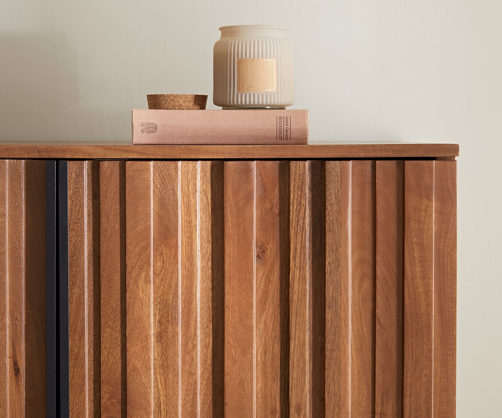 Skriňa Sivela sa vyznačuje pôsobivým 3D vzhľadom, výsledkom majstrovskej remeselnej práce, ktorá každému kusu dodáva jedinečný charakter. Jemné odtiene manga dreva zdôrazňujú jedinečnosť každej skrine a robia z nej osobný prejav vášho štýlu. Dodávaná čiastočne zmontovaná, vyžaduje iba montáž nôh, čo vám umožní rýchlo a jednoducho začleniť do svojho domova dizajnový kúsok modernej bytovej kultúry.