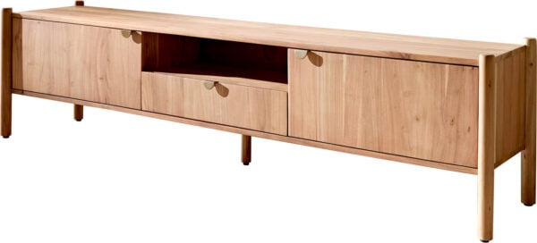 Zažite pôsobivú eleganciu TV stolíka Caius z ušľachtilého akáciového dreva Aura! S dĺžkou 200 cm ponúka tento nábytok dostatok miesta pre vaše multimediálne zariadenia a dekorácie. Štyri dvierka umožňujú praktické a usporiadané uloženie, takže všetko má svoje miesto. Akáciové drevo v prírodnej farbe Aura dodáva vašej obývačke teplú a prirodzenú atmosféru, ktorá pozýva na oddych. Výnimočným prvkom sú okrúhle nohy, ktoré sa plynulo tiahnu od vrchu až po spodok v rohoch TV stolíka, čím mu poskytujú výnimočnú stabilitu a jedinečný vzhľad. Elegantné úchytky z mosadze v zlatej farbe a frézované hrany podčiarkujú vysokú kvalitu spracovania a štýlový dizajn.