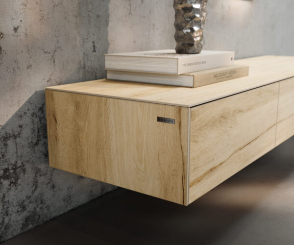Pravá Laminam® keramika z Talianska, známa po celom svete svojou krásou a odolnosťou, žiari na TV stolíku CUOR v jemných drevených odtieňoch pripomínajúcich vzácny dub a inšpirovaných jedinečnými farbami piesku pri slávnej benátskej lagúne. Pôsobivá farebná hra s jemnou, plynulou kresbou dodáva CUOR teplý a prívetivý charakter, ktorý robí tento ikonický dizajn takým jedinečným. Pre ešte pôsobivejší efekt je nábytok pevne pripevnený priamo na stenu stabilným držiakom. Závesný vzhľad prináša ľahkosť a obzvlášť harmonický vzhľad.