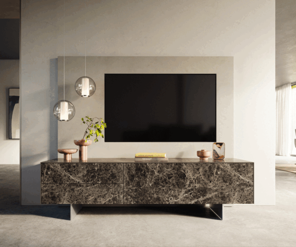 Dizajn stretáva eleganciu – TV stolík CUOR z keramickej Laminam® v tmavohnedej farbe Emperador