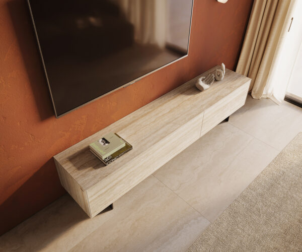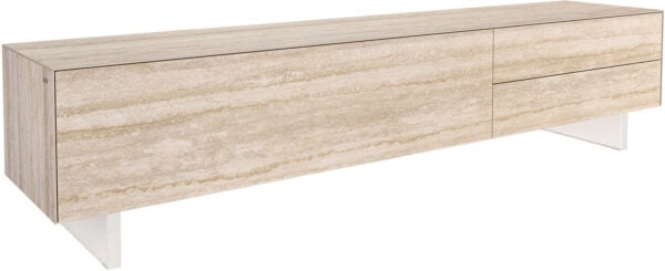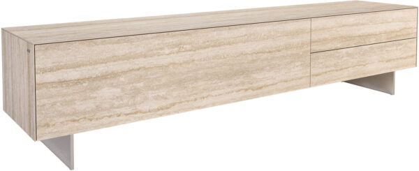 TV stolík Cuor 220 cm keramika Laminam® Travertino Bianco krémovo biela 1 výklopné dvierka 2 zásuvky podstava závesná kov čierna