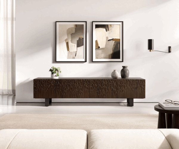 TV stolík Follia s podstavou z čierneho kovu je silným vyjadrením modernej prírodnosti. Frézované čelo z tmavého manga dreva očarí svojou hĺbkou a jemnými svetelnými odleskami, ktoré oživujú každú štruktúru dreva. Na matne čiernych podstavách vzniká zaujímavý kontrast medzi ušľachtilým prírodným materiálom a mestským dizajnom – ideálne pre moderné, štýlové bývanie.
