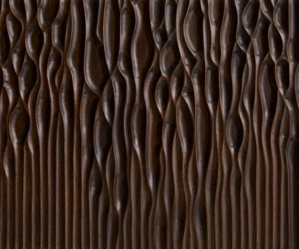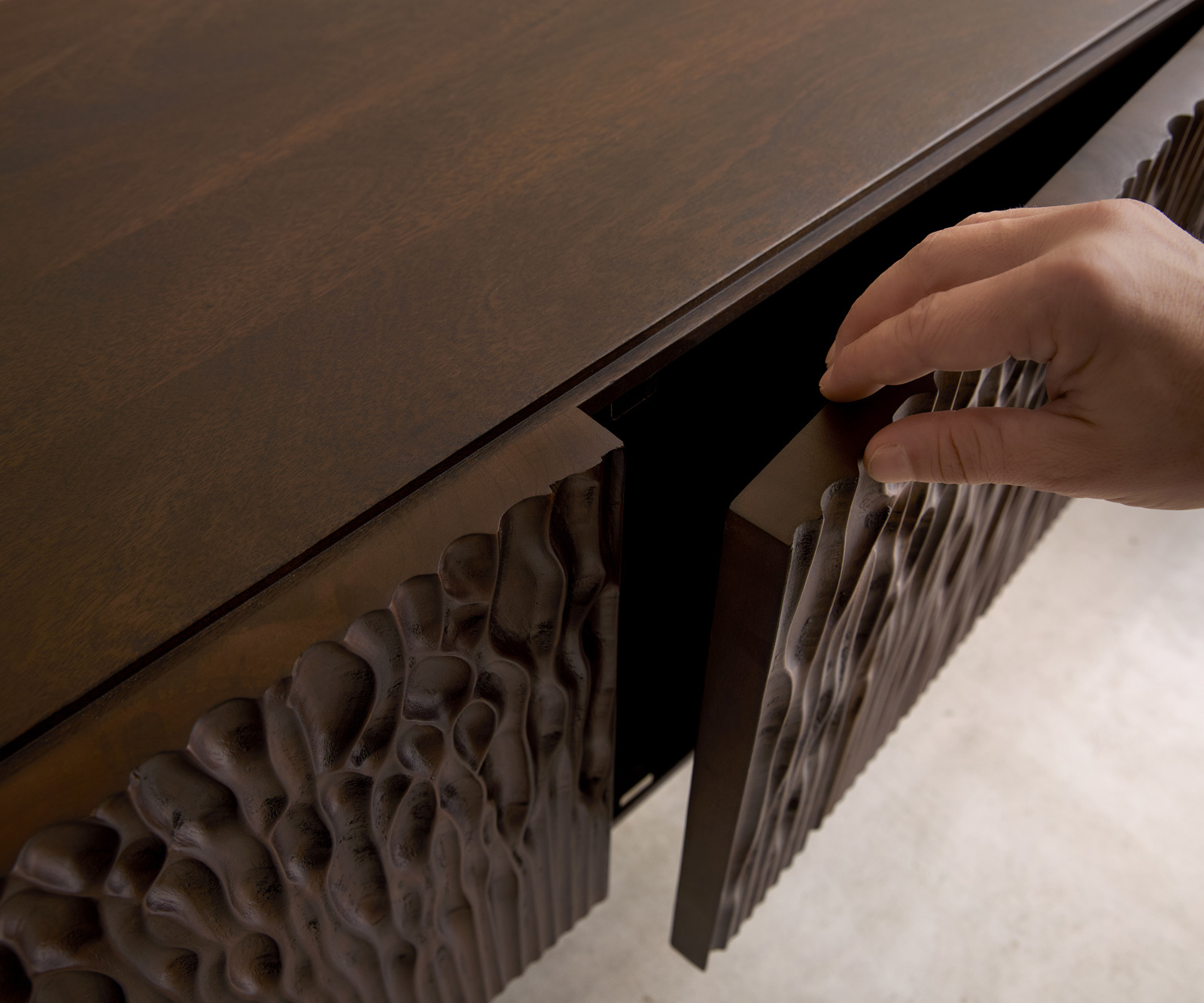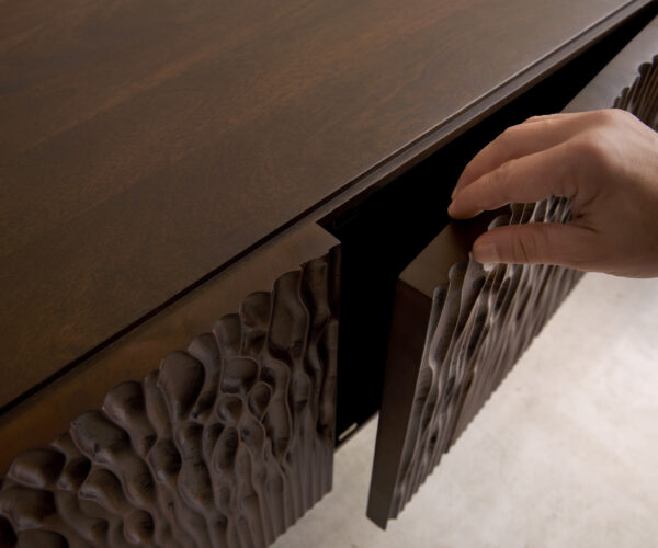 TV stolík Follia s podstavou v tvare „L“ z kefovanej nerezovej ocele spája remeselnú zručnosť s modernou eleganciou. Čelo z tmavého mangového dreva ukazuje mimoriadne detailné frézovanie, ktoré nábytku dodáva hĺbku a výraz. Na čistých nerezových nohách pôsobí masívny korpus ľahko a zároveň vznešene – kus nábytku, ktorý každú miestnosť obdarí štýlovým centrom.