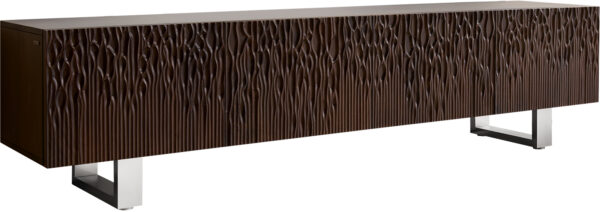 TV stolík Follia je vyjadrením dreva a remeselného spracovania. Čelo z tmavého mangového dreva zaujme svojou umelecky frézovanou povrchovou úpravou, ktorá pri každom dopade svetla odhaľuje nové odtiene. Teplý odtieň dodáva nábytku hĺbku a eleganciu, zatiaľ čo podstavce v tvare „L“ z kefovanej nerezovej ocele vytvárajú moderný, závesný vzhľad. Kus nábytku, ktorý dokonale spája prírodnosť a dizajn.