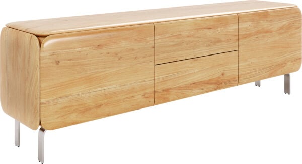 TV stolík z akáciového dreva v prírodnej farebnej variante prináša vďaka svojej elegantnej optike a premyslenému dizajnu nádych rafinovanosti do tvojej obývačky. Najmä všade zaoblené hrany, ktoré sú vyrobené náročnou ručnou prácou, dodávajú TV stolíku harmonický a jemný tvar. Tento výrazný štýlový prvok zvýrazňuje moderný dizajn a dodáva nábytku jeho jedinečný charakter. S dvomi dvierkami a dvomi zásuvkami ponúka dostatok úložného priestoru pre tvoje mediálne zariadenia a každodenné predmety.