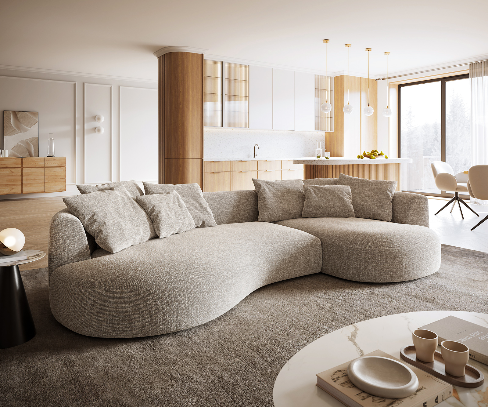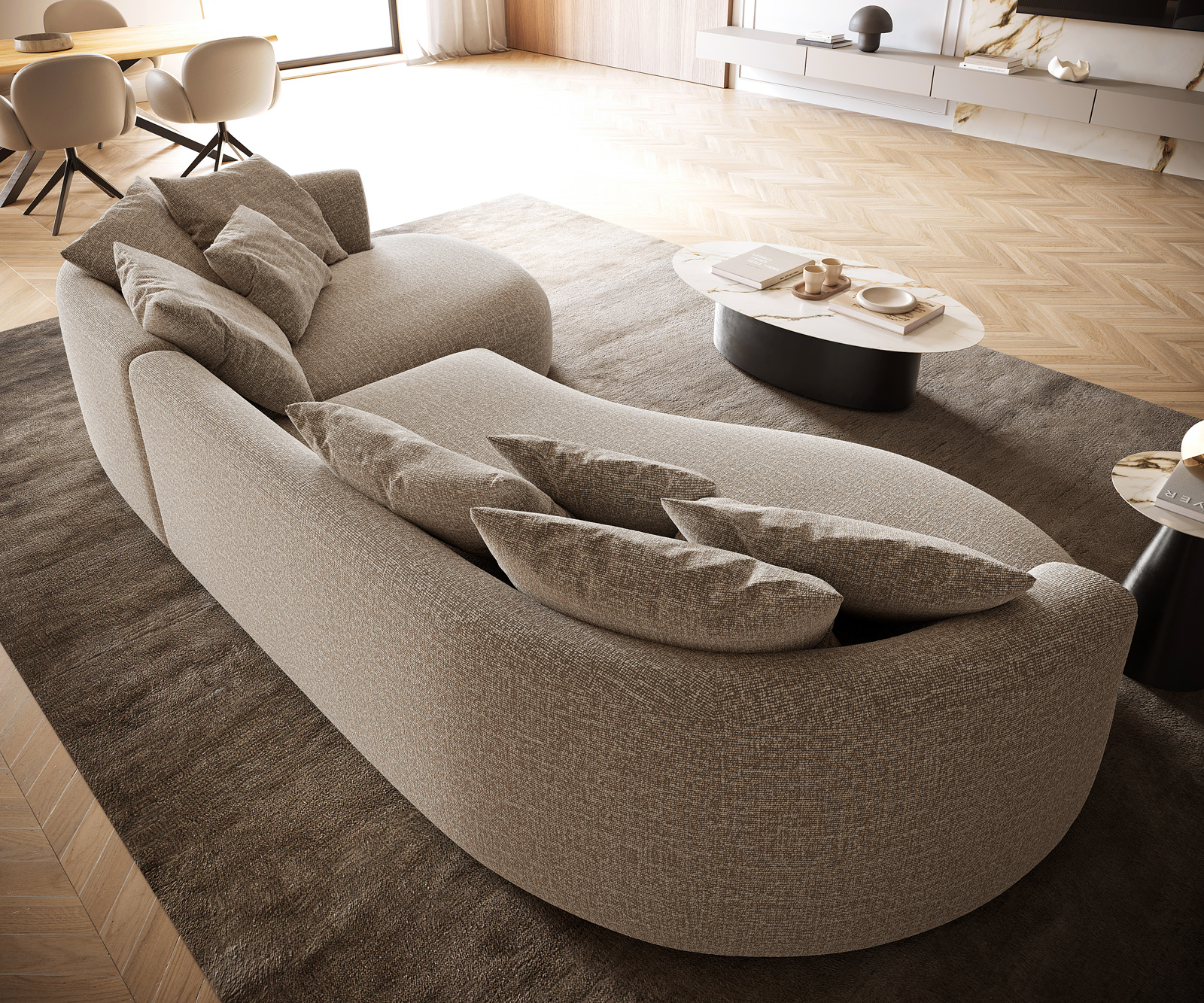 Objavte našu XXL pohovku EDINA, ktorá svojím elegantným, organickým tvarovaním nastavuje nové štandardy vo vašej obývacej izbe. Priestranné rozmery 330×170 cm vám ponúkajú nielen veľa miesta na oddych, ale aj na spoločenské večery. Kombinuje najmodernejšie dizajnové požiadavky s maximálnym komfortom. Nechajte sa objať jemnými tvarmi a priestranným čalúnením a zažite, ako sa táto pohovka stane stredobodom vášho domova. Naznačené ležadlo (ležadlo typu récamiere) dopĺňa dizajn a pozýva vás na oddych. Doprajte si to najlepšie a zažite nový vrchol vo vašom domove.