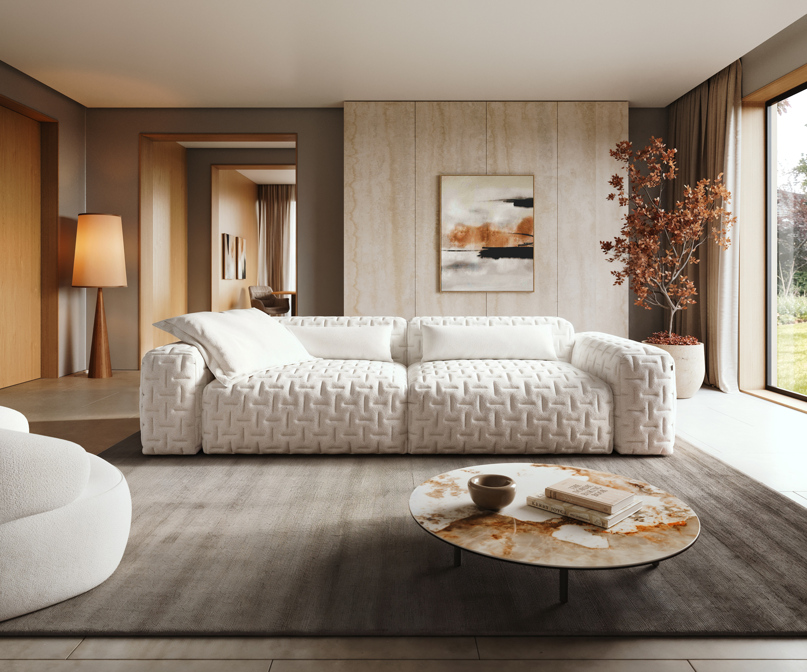 Veľká pohovka Freestyle nie je len pohovka, ktorú si jednoducho kúpiš – je to pohovka, ktorú si vytvoríš sám. So svojím príjemne mäkkým Bouclé Soft béžová a charakteristickou povrchovou úpravou určuje prešívaný vzhľad celkový dojem: charakteristická, prešívaná povrchová úprava pozýva k opretiu – plastická, mäkká a útulná. Tak vzniká útočisko, ktoré prináša do tvojho domova teplo a pokoj.