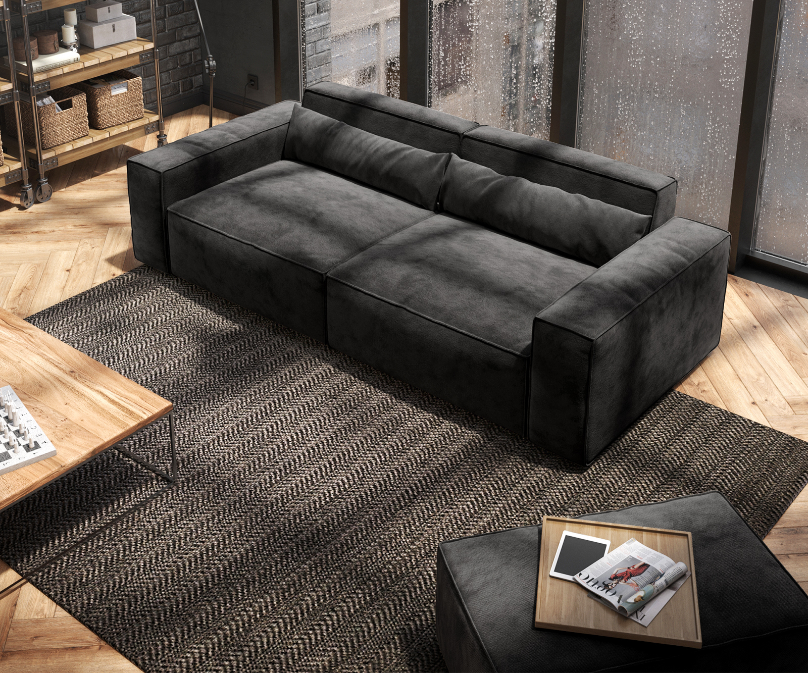 Impozantná veľká pohovka Sirpio má vďaka svojmu priamočiaro obdĺžnikovému dizajnu, ktorý nevyužíva žiadne rušivé nohy, mimoriadne moderný vzhľad, ktorý každému priestoru dodáva sofistikovanú luxusnú atmosféru. Moderné prepracované lemovanie svedčí o mimoriadne kvalitnom, detailne spracovanom prevedení tohto elegantného kusu nábytku. Priestranná veľká pohovka disponuje hlbokým sedadlom pre pohodlné sedenie a vďaka poťahu na zadnej strane ju možno umiestniť voľne do priestoru. V dodávke zahrnutý taburet poskytuje navyše pohodlnú plochu na ležanie. Môže sa však tiež výborne využiť ako ďalšie miesto na sedenie alebo praktická odkladacia plocha.