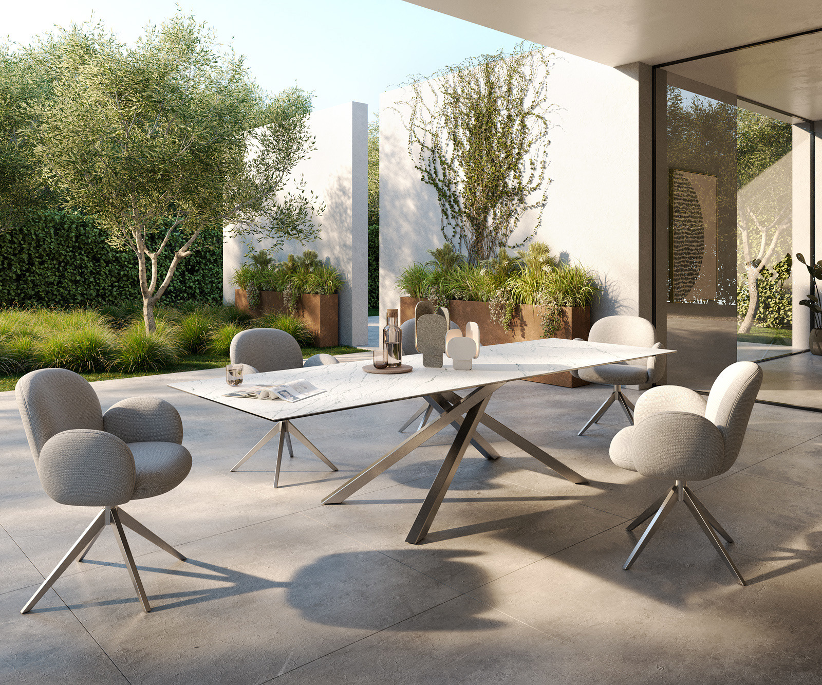 Elegantná stolová doska z pravého Laminam® keramiky robí tento stôl Edge niečím výnimočným. Je inšpirovaná slávnym sochárskym mramorom a svojou hladkou, takmer mäkkou textúrou pôsobivo odráža podstatu tohto úžasného materiálu. Napriek tomu je doska mimoriadne odolná proti poškriabaniu a dodáva tvojmu vonkajšiemu priestoru jedinečne elegantnú atmosféru.