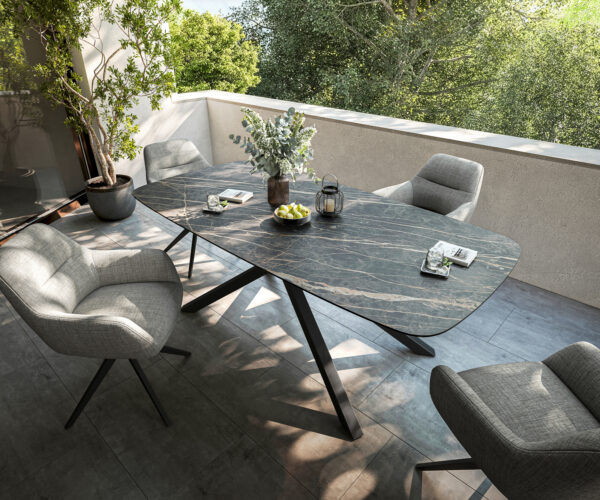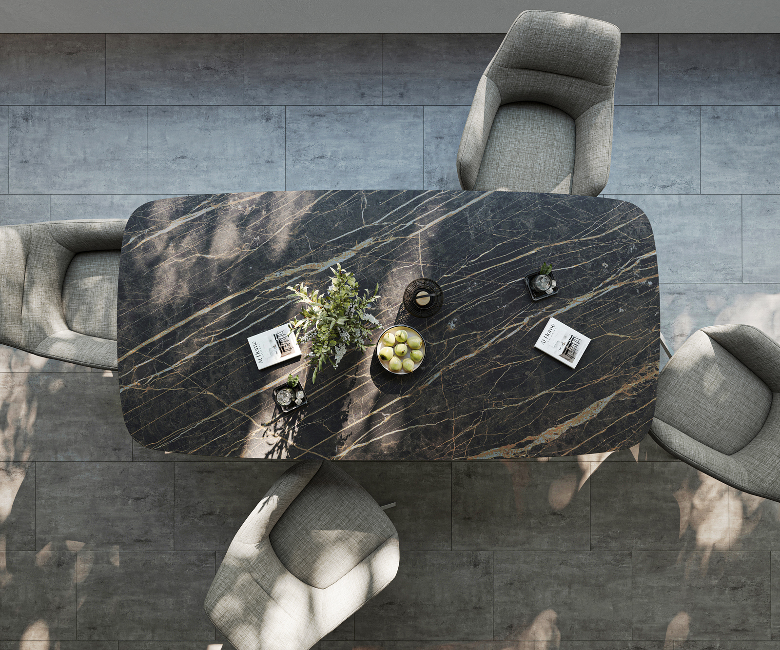 Stôl Edge v jeho výnimočnom oválnom tvare bol vyrobený z pravého talianskeho keramického materiálu Laminam® v jedinečnom hnedom odtieni Noir Desir a okrem svojej úžasnej optiky zaujme predovšetkým svojou odolnosťou a každodennou použiteľnosťou. Doska stola pripomína mohutný tmavý mramor, ktorý je pretkaný vzorom ohromujúcich, krivolakých vĺn a s pôsobivou intenzitou odráža všetky tváre prírody – od silnej a vášnivej až po jemnú a nežnú. Štruktúrovaná textúra dodáva materiálu ešte väčší výraz a spája čistý dizajn so silou prírody.